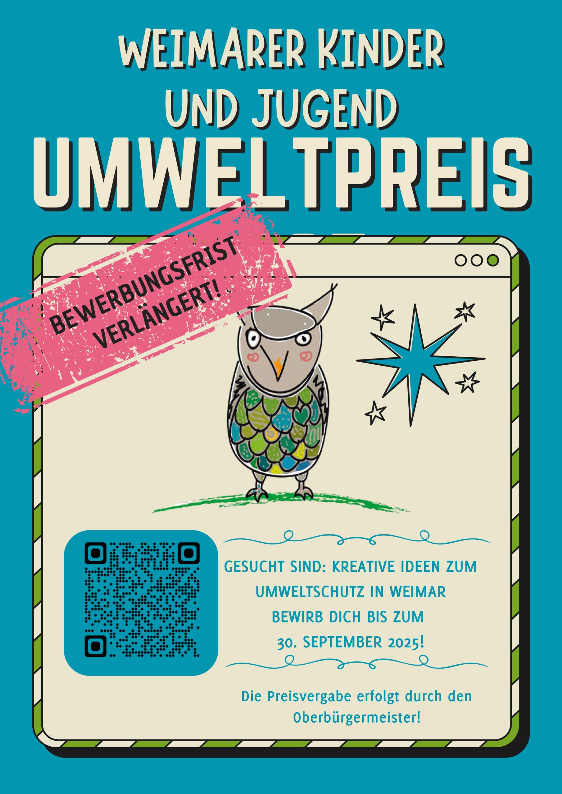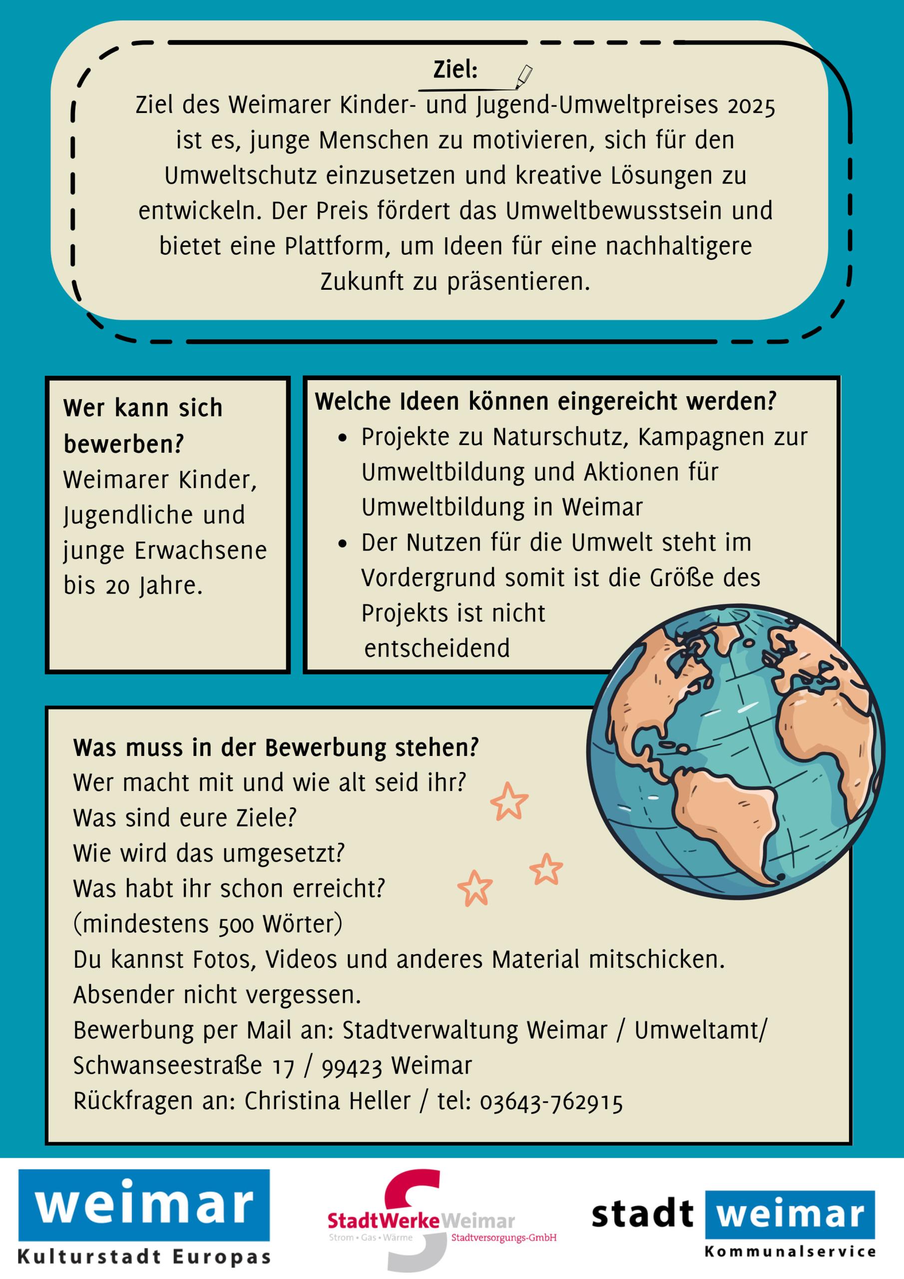 Der Kinder- und Jugendumweltpreis soll Projekte von Kindern, Jugendlichen und jungen Erwachsenen auszeichnen, die sich kreativ und aktiv für den Umweltschutz in Weimar einsetzen. Neben Einzelpersonen sind auch Gruppen z. B. aus Weimarer Schulen, Kindergärten oder anderen Einrichtungen herzlich eingeladen, sich zu bewerben. Hilfe von Erwachsenen ist erlaubt. Alle Weimarer bis 20 Jahre dürfen teilnehmen.