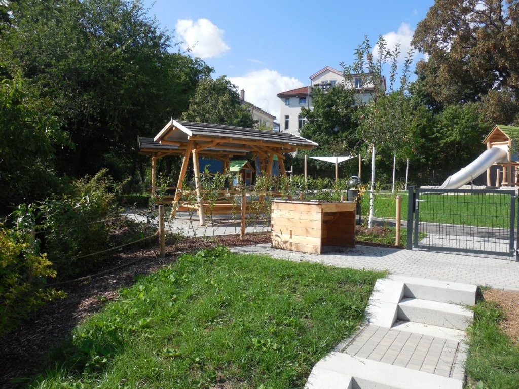 Das Gestaltungskonzept für das Hortgelände unter dem Thema „Karibikinsel“ hatte hier weiterhin Bestand. Der Freiraum wurde themengerecht in verschiedene Bereiche gegliedert: Spielbereich „Dschungel“, Ballspielfeld „Bergsee“, Spielbereich „Felslandschaft“, Spielbereich „Karibikdorf“, Aufenthaltsbereich „Grünes Tal“ und den Schulgartenbereich. Die verschiedenen Bereiche wurden durch einen barrierefreien, asphaltierten Rundweg miteinander verbunden, der auch als Fahrbahn für Spielfahrzeuge (Roller etc.) genutzt werden kann. In Verbindung mit dem neuen, geschwungenen Rundweg erfolgte eine landschaftliche Gestaltung. Das Gelände wird höhenmäßig so angepasst, dass unterschiedliche Spielebenen entstehen.