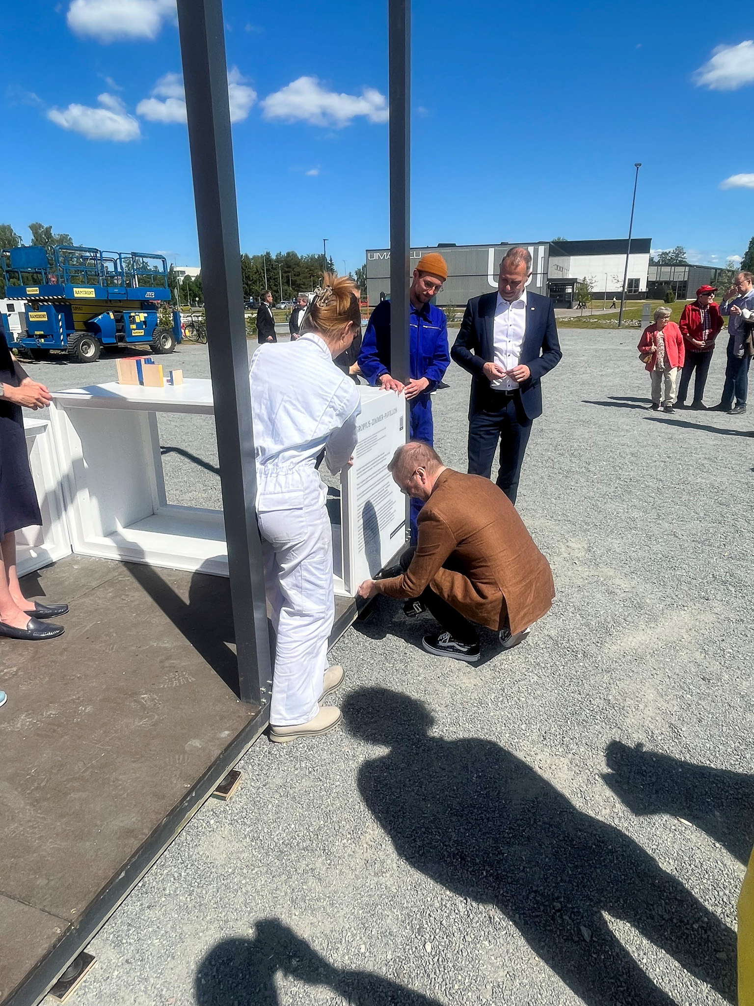 Bei schönstem nordischen Sonnenschein ist am 10. Juni 2023 der Weimarer Gropius-Zimmer-Pavillon in der finnischen Partnerstadt Hämeenlinna eröffnet worden. Gemeinsam mit Bürgermeister Olli-Poika Parviainen schraubte Oberbürgermeister Peter Kleine die finnische Infotafel zum Pavillon an und eröffnete damit symbolisch den 5 Meter Kantenlänge messenden Kubus. Dieser war zuvor vier Tage von den Studierenden der Bauhaus-Universität Bálint Kemény, Julian Pracht, Hannah Ernst und Raphael Witte unter Leitung der Initiatorin und Projektverantwortlichen Julia Heinemann aufgebaut worden. An der feierlichen Eröffnungszeremonie nahmen auch Bauhaus-Uni-Präsident Peter Benz und Vertreterinnen des neuen Präsidiums teil.