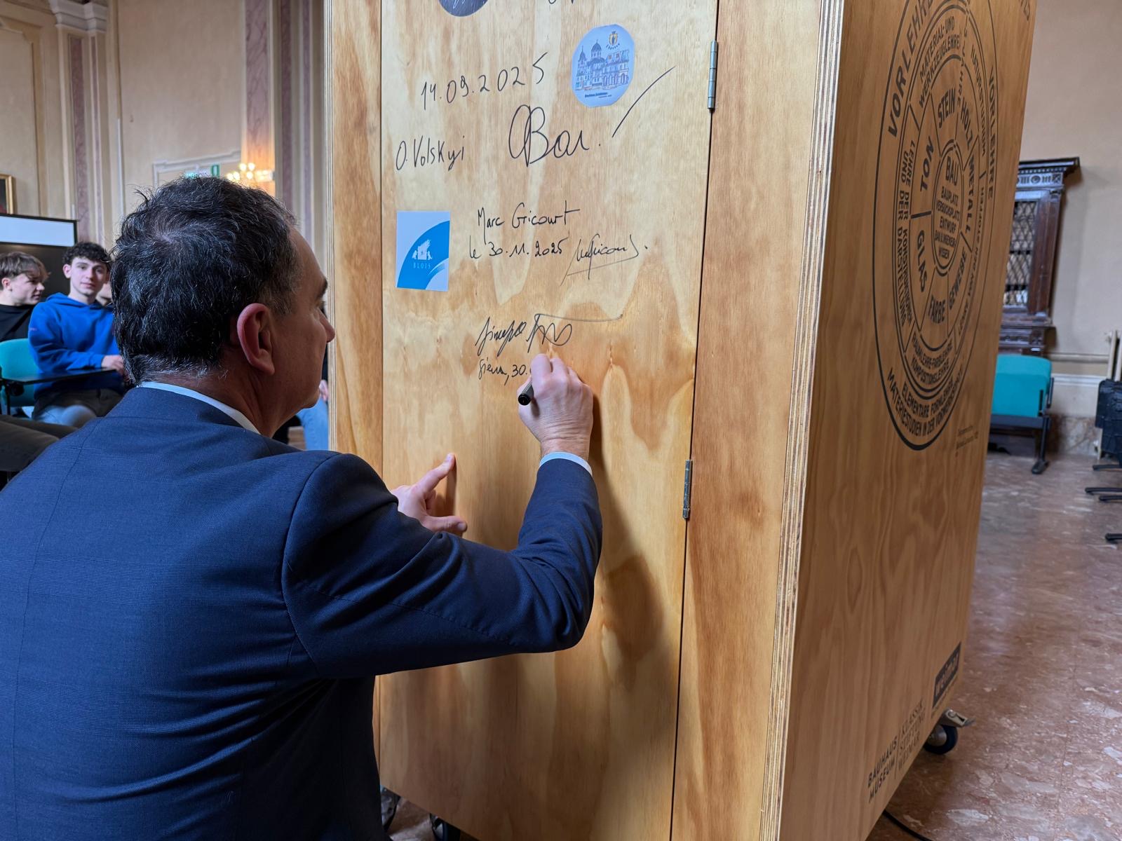 Seit dem vergangenen Wochenende (31. Januar 2026) können sich Bürgerinnen und Bürger der toskanischen Kulturstadt Siena in besonderer Weise über die Anfangsjahre des Weimarer Bauhauses vor über einhundert Jahren informieren: Im Liceo Enea Silvio Piccolomini eröffneten Weimars Bürgermeister Ralf Kirsten, die stellvertretende Vorsitzende des Weimarer Stadtrates, Annette Projahn, und Sienas Kulturdezernent Giuseppe Giordano die mobile Ausstellung im Koffer-Format. Im Beisein von zahlreichen Schülerinnen und Schülern des Lyzeums erreichte sie damit auf ihrer Europa-Reise durch Weimars Partnerstädte nach Hämeenlinna (Finnland), Zamość (Polen), Schowkwa (Ukraine) und Blois (Frankreich) ihre vorletzte Station.