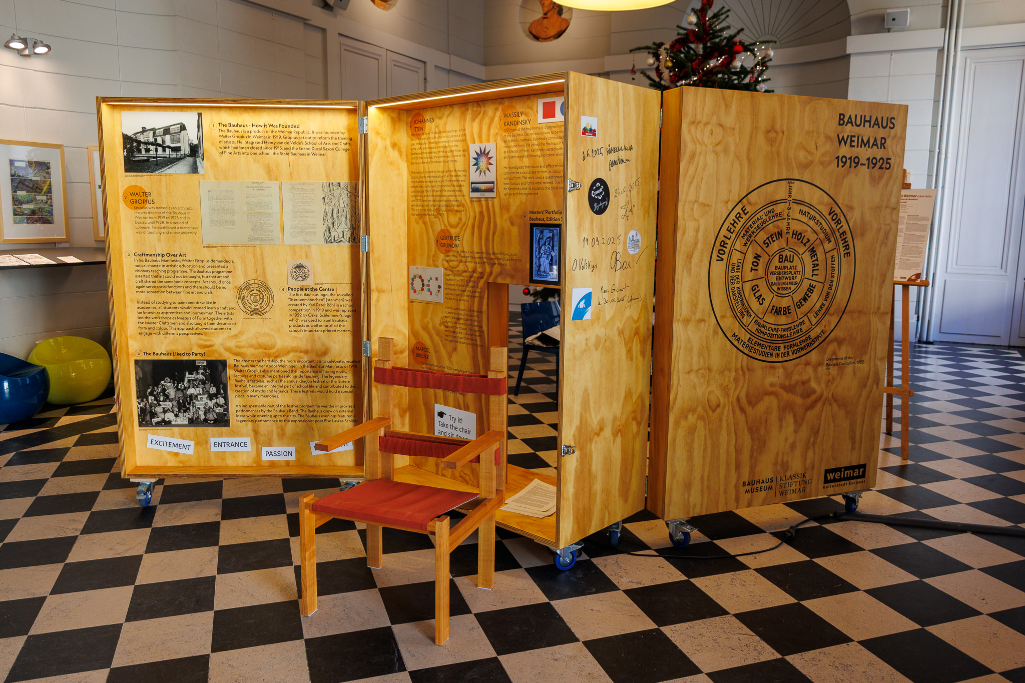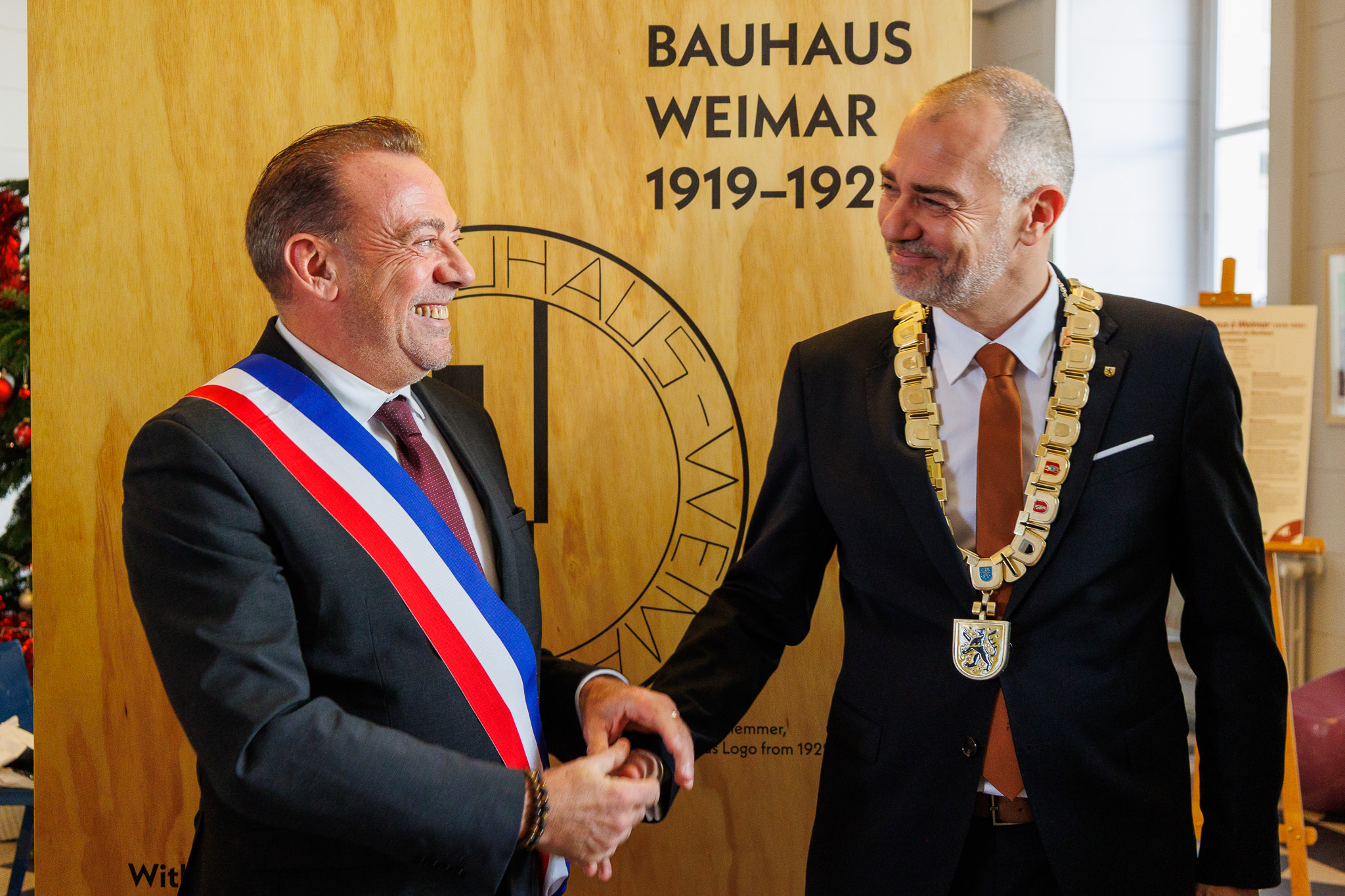 Seit Sonntag, 30.11.2025, hat die „Kleinste Bauhaus-Ausstellung der Welt“ ihre nächste Reiseetappe auf dem Weg durch Weimars Partnerstädte erreicht: Oberbürgermeister Peter Kleine eröffnete sie gemeinsam mit der Weimarer Stadtratsvorsitzenden Katrin Götz und dem Bürgermeister von Blois, Marc Gricourt, im Rathaus der französischen Stadt an der Loire. Die Ausstellung war zuvor bereits in Hämeenlinna (Finnland), Zamosc (Polen) und Schowkwa (Ukraine) zu sehen. Die mobile Ausstellung bringt die Ideen, Werke und Geschichten aus der Gründungszeit des Bauhauses in die Partnerstädte Weimars. Im Gepäck: Visionen von Gropius, Farbexperimente Kandinskys, textile Entwürfe von Benita Koch-Otte und der Geist legendärer Bauhaus-Feste. Ein Highlight ist der Nachbau des legendären Latten-Stuhls von Marcel Breuer zum Herausnehmen, auf dem die Besucherinnen und Besucher Probesitzen dürfen. Ob in Plakaten, Möbeln oder Typografie – das Bauhaus wirkt bis heute aus Weimar in die ganze Welt.