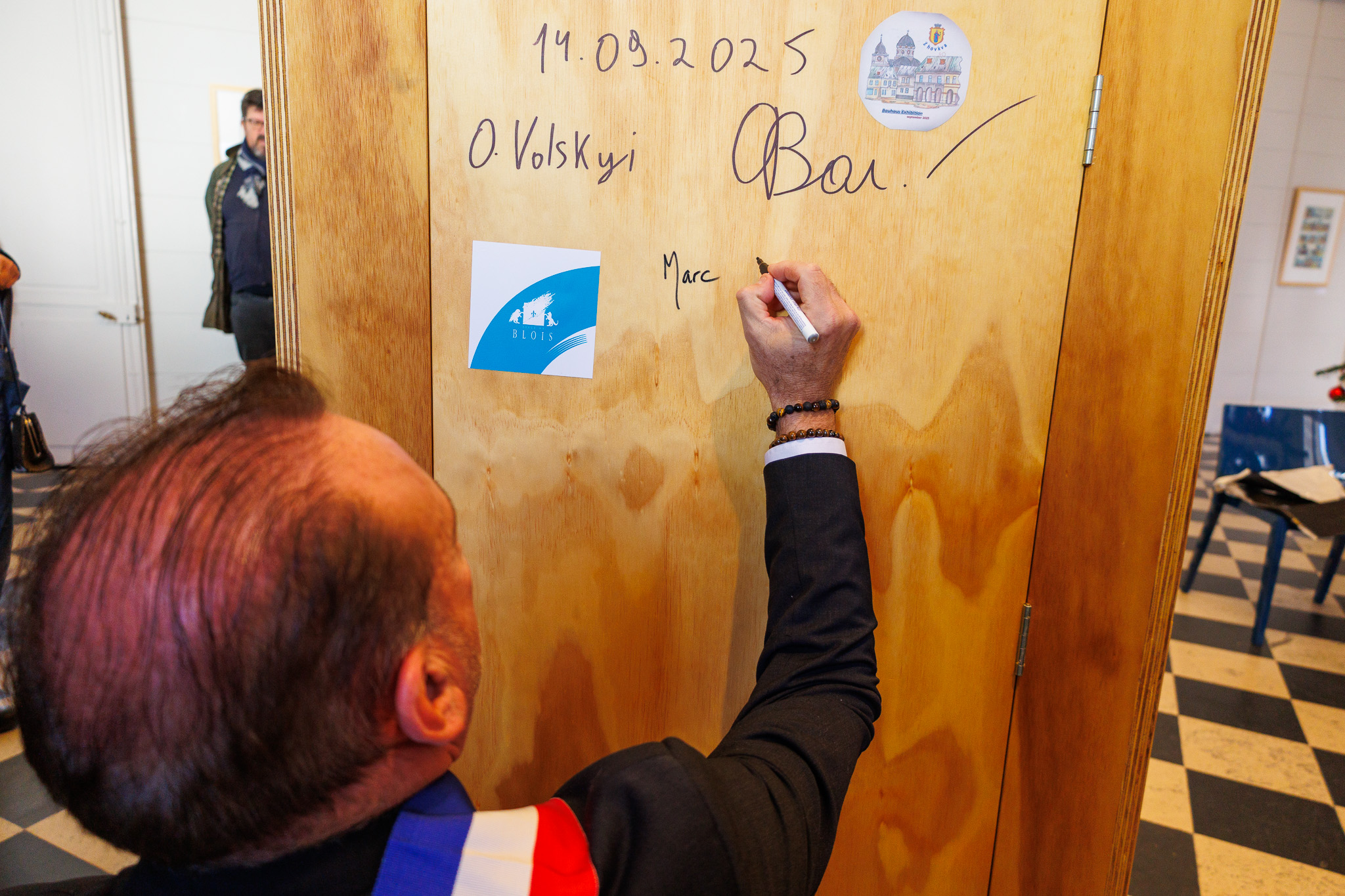 Im Rahmen seines Kurzbesuches aus Anlass der Ausstellungseröffnung und der 30-jährigen Städtepartnerschaft zwischen Blois und Weimar nutze Oberbürgermeister Kleine die Gelegenheit, seinen Amtskollegen Marc Gricourt für sein persönliches Engagement für eine lebendige Städtepartnerschaft mit der Ehrengabe der Stadt Weimar auszuzeichnen. Sichtlich bewegt nahm Marc Gricourt die von der Weimarer Künstlerin Nane Adam geschaffene Brosche in Form eines Stolpersteines sowie eine Urkunde entgegen. Darin heißt es „Damit ehrt die Stadt Weimar seine langjährige kraftvolle Unterstützung der lebendigen Verbindung zwischen unseren Städten und ihren Bürgerinnen und Bürgern, insbesondere der Jugend. Marc Gricourt hat der Städtepartnerschaft zwischen Blois und Weimar von Beginn seiner Amtszeit an eine außergewöhnliche Bedeutung beigemessen und lebt dieses Engagement mit großer persönlicher Überzeugung. Er hat die zahlreichen gemeinsamen Projekte mit Offenheit, Unterstützung und den nötigen Ressourcen vorangebracht und damit entscheidend zu Ihrem Erfolg beigetragen. Seine zahlreichen Aufenthalte in Weimar, insbesondere anlässlich der Feiern zur Befreiung des ehemaligen Konzentrationslagers Buchenwald unterstreichen eindrucksvoll, wie ernst ihm die gemeinsamen Werte und die historische Verantwortung unserer beiden Städte sind. Dafür ist ihm Weimar zu großem Dank verpflichtet.“