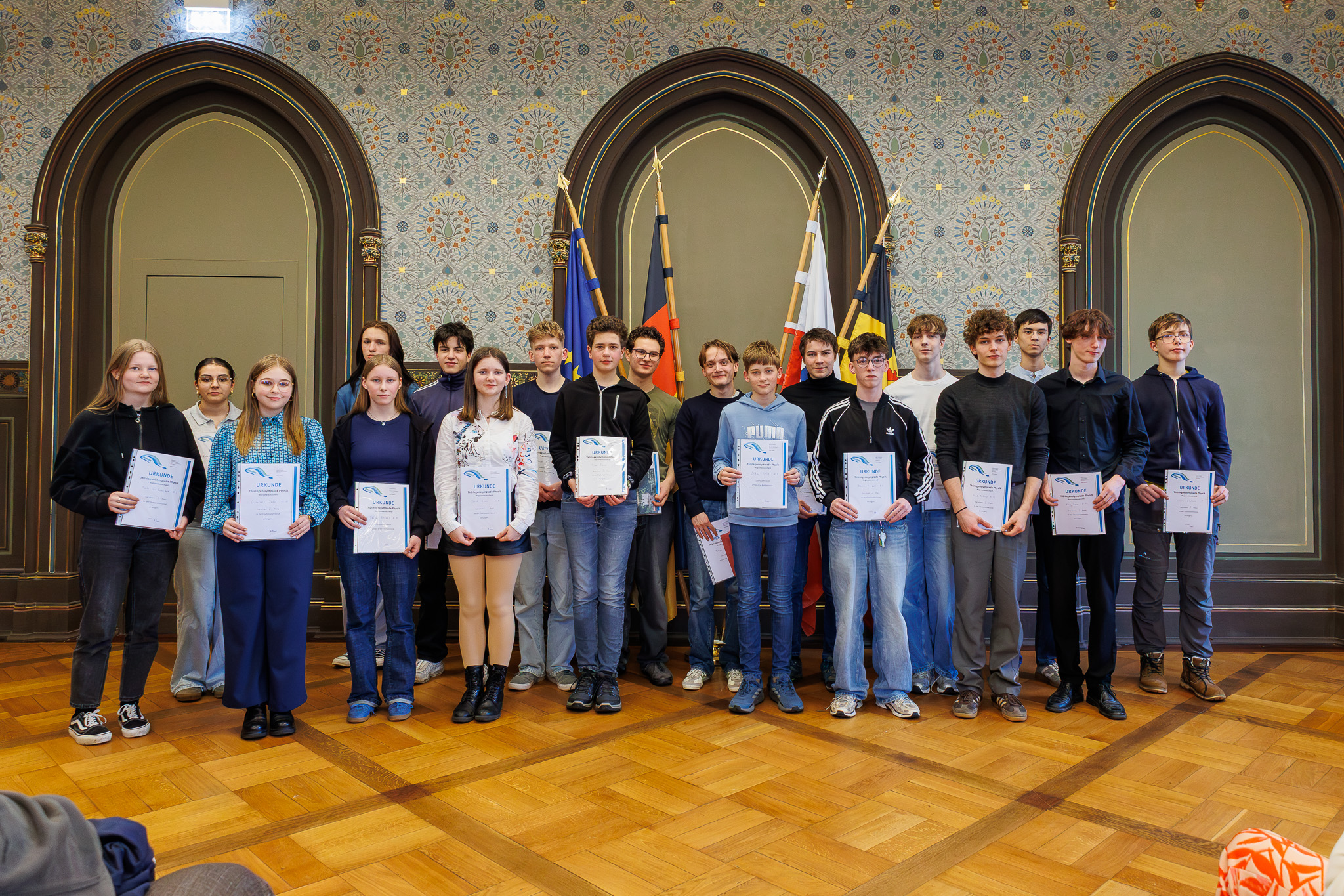 Am Mittwochnachmittag dieser Woche zeichnete Oberbürgermeister Peter Kleine im Festsaal des Rathauses die Preisträgerinnen und Preisträger der Thüringer Landesphysikolympiade aus der Region Weimar aus. Die Veranstaltung stand im Zeichen der Förderung junger Talente in den Naturwissenschaften und wird seit vielen Jahren von Heiko Bauer, Lehrer am Friedrich-Schiller-Gymnasium Weimar, mit großem Engagement organisiert.