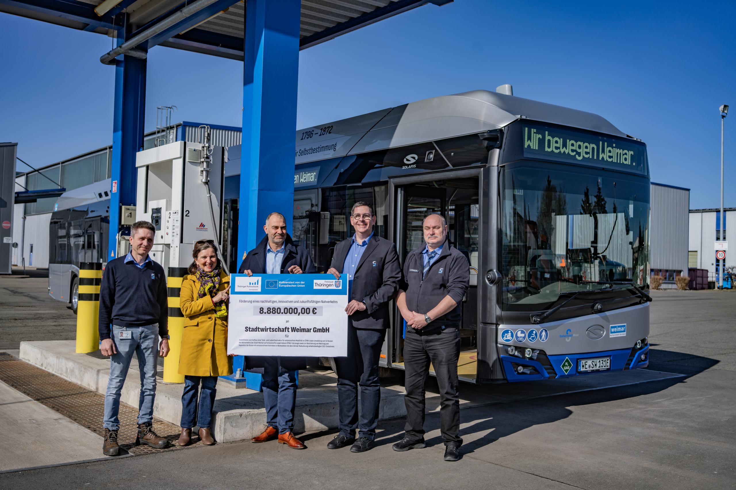 Die Stadtwirtschaft Weimar GmbH erhält 8,88 Millionen Euro Fördermittel der Thüringer Aufbaubank für den Ausbau eines klimaneutralen ÖPNV. In den nächsten drei Jahren werden 12 neue emissionsfreie Busse (Solo- und Gelenkfahrzeuge) beschafft, die batterieelektrisch fahren und mit einer Wasserstoff-Brennstoffzelle als Reichweitenverlängerung ausgestattet sind. Dies garantiert maximale Betriebssicherheit und Alltagstauglichkeit. Parallel entsteht eine moderne Lade- und Tankinfrastruktur und die Werkstätten werden technisch aufgerüstet.