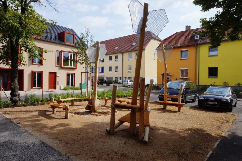 Viele Bänke laden zum Ausruhen ein. Die Elemente des Spielplatzes erinnern an Vogelnester.
