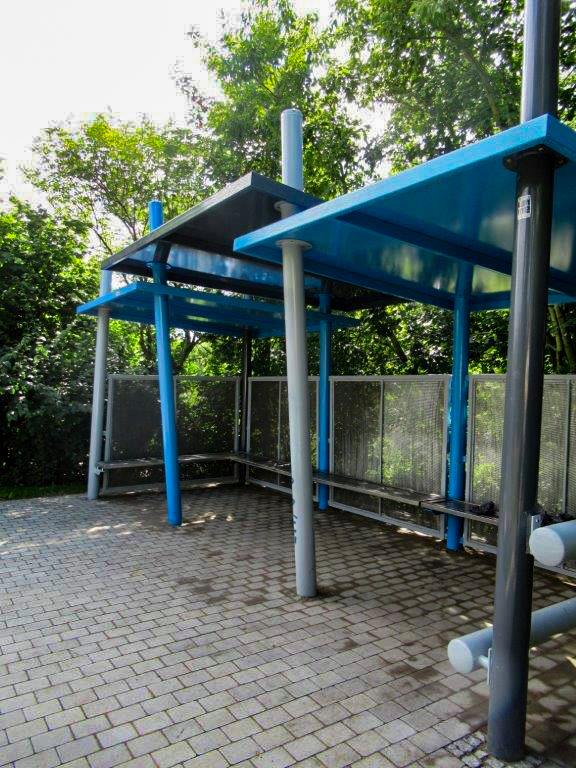 Die Skateanlage auf der Asphaltfläche bietet mehrere Rampen, die Skatern und Bikern verschiedene Möglichkeiten für Tricks und Fahrspaß bieten. Direkt daneben befindet sich ein überdachtes Treffpunkthaus mit zahlreichen Sitzmöglichkeiten, das als Rückzugsort und Treffpunkt dient.