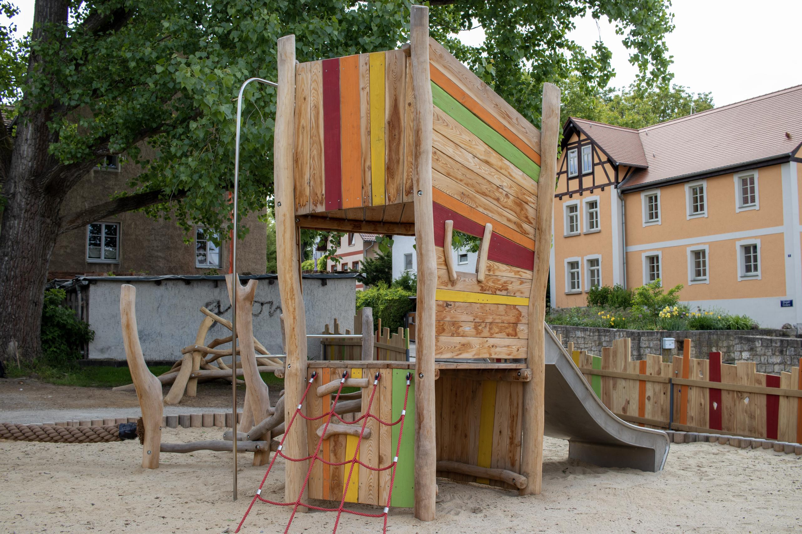 Der Spielplatz in Ehringsdorf bietet vielseitige Spielmöglichkeiten für Kinder verschiedener Altersgruppen. Eine große Holzkletteranlage lädt zum Klettern, Rutschen, Balancieren, Verstecken und Verweilen ein.