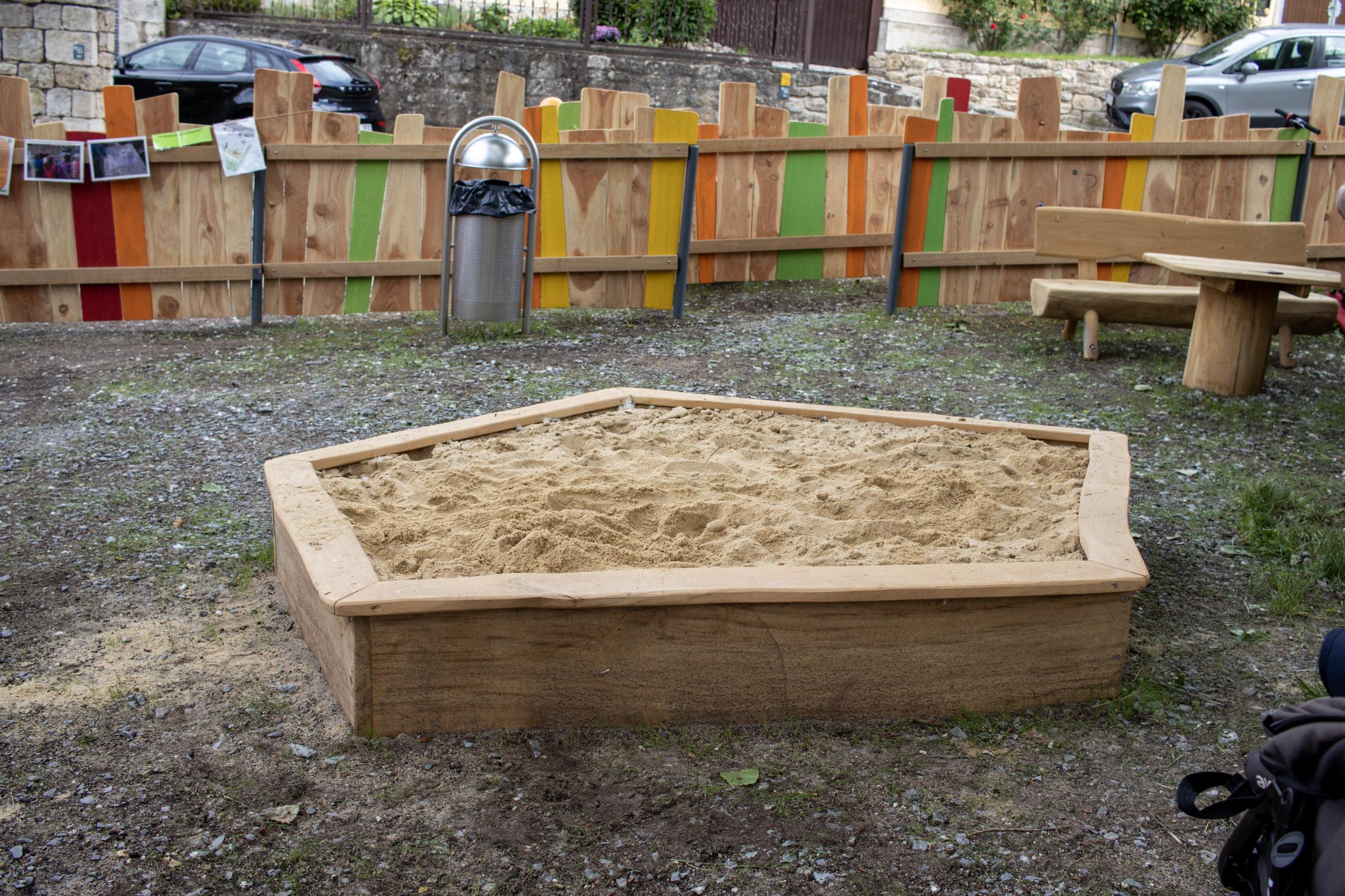 Für die Kleinen gibt es einen Sandkasten sowie eine kleine Wippe. Mehrere Bänke und ein Tisch bieten Sitzgelegenheiten für Eltern und Begleitpersonen.