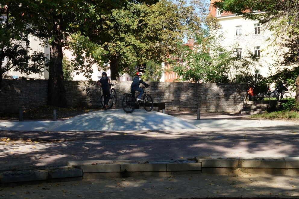 Eine Wasserpumpe und ein Wassersprungelement bieten in der warmen Jahrenszeit eine schöne Abkühlung. Auf den großen Wiesen im Weimarhallenpark ist Ballspielen erlaubt. Hier kann man auch prima im Schatten Picknick machen.