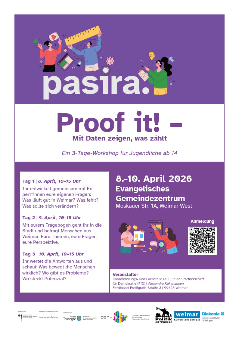 Vom 8. bis 10. April 2026 (jeweils 10–15 Uhr) findet in Weimar ein dreitägiger Workshop für Jugendliche ab 14 Jahren statt. In Kooperation mit Politik zum Anfassen e.V. analysieren die teilnehmenden jungen Menschen gemeinsam die Lebenssituation in Weimar und entwickeln Ideen für die Zukunft.