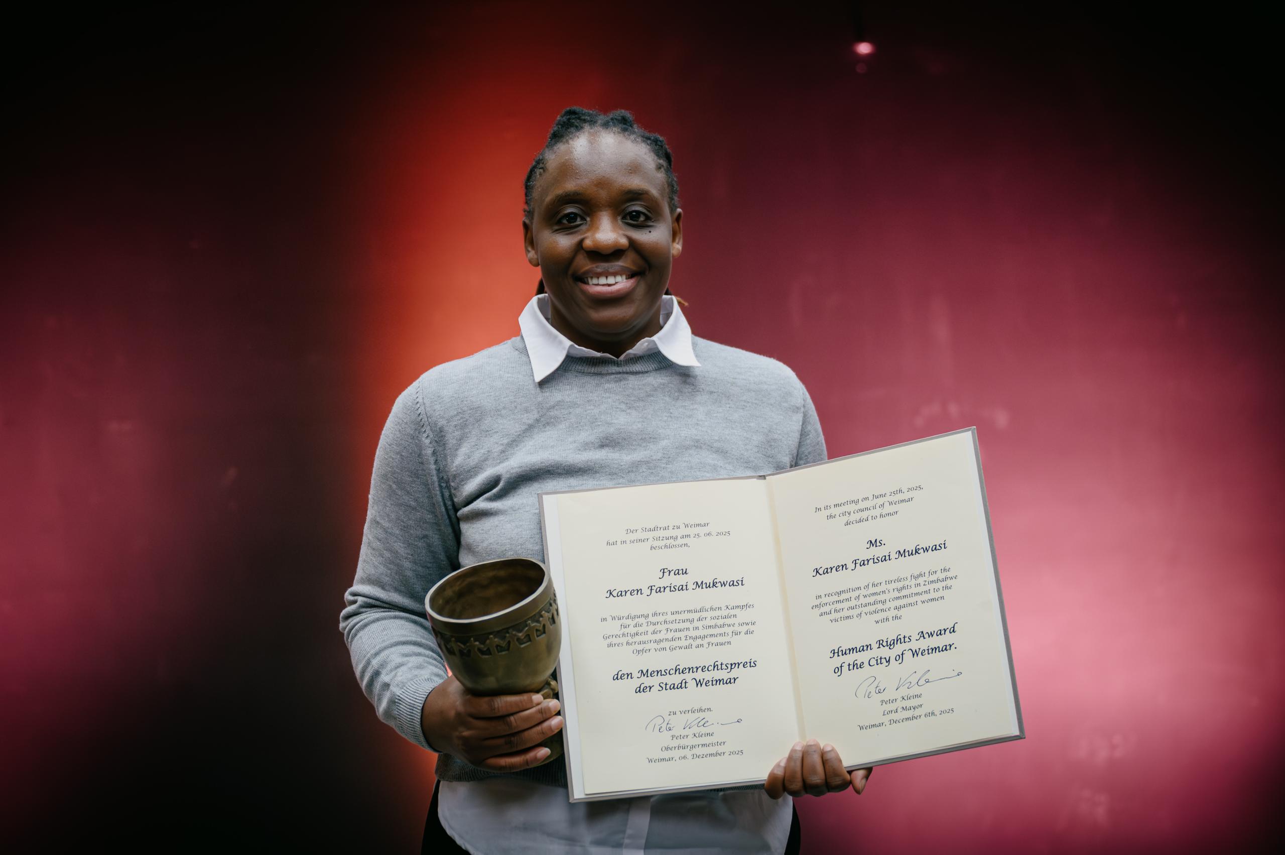 Der Stadtrat hat in seiner Sitzung am 25. Juni 2025 dem Vorschlag des Vergabebeirats zugestimmt, Frau Karen Farisai Mukwasi aus Simbabwe mit dem Menschenrechtspreis der Stadt Weimar 2025 zu ehren.