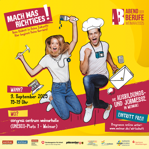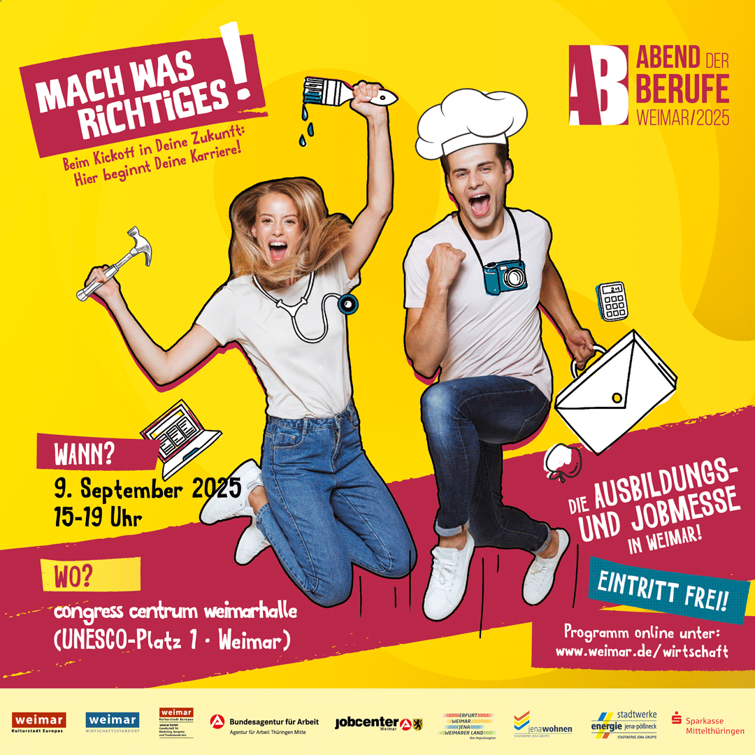 Bereits zum 20. Mal findet am 9. September 2025 der Abend der Berufe in der Weimarhalle statt – eine zentrale Veranstaltung zur Berufsorientierung und Fachkräftesicherung in der Region. Was einst als kleiner Informationsabend an einer Regelschule begann, hat sich über die Jahre zu einer der größten Ausbildungsmessen Thüringens entwickelt.