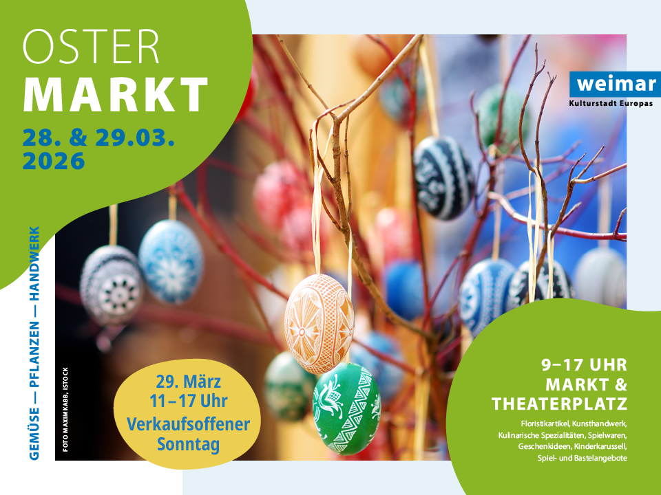 Mit dem Weimarer Ostermarkt startet am Wochenende vor Ostern die Marktsaison in der Weimarer Innenstadt. Als erster Markt des Jahres lädt er am 28. und 29. März jeweils von 9 bis 17 Uhr auf den Marktplatz zum Bummeln, Genießen und Mitmachen ein. Auch in diesem Jahr wird der Markt zusätzlich auf den Theaterplatz ausgeweitet, wo weitere Kunsthandwerkerinnen und Kunsthandwerker sowie Versorgungsstände ihre Waren präsentieren.