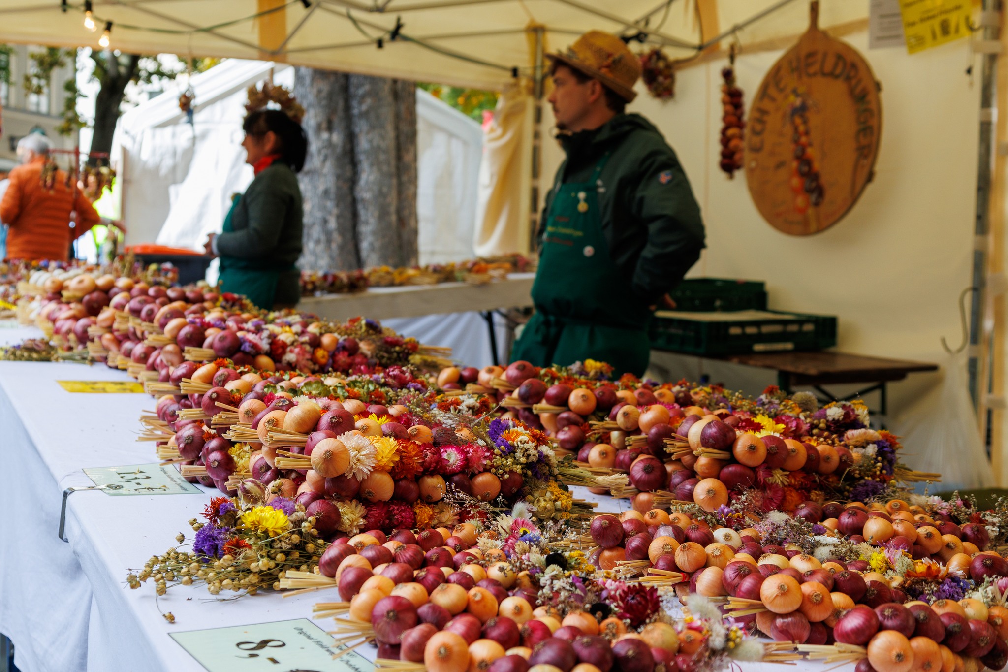 Den traditionellen Kern des Zwiebelmarktes mit seinen über 400 Händlern und Ausstellern bildeten auch in diesem Jahr wieder die Heldrunger Zwiebelbauern. Ihre Stände mit den beliebten handgefertigten Zwiebelrispen, Gewürzsträußen und Zwiebelinchen erfreuten sich großer Beliebtheit. Aufgrund des regenreichen Sommers in diesem Jahr konnten die Zwiebeln diesmal besonders groß geerntet werden – entsprechend üppig fielen auch die Zwiebelprodukte aus. Die Sortimente waren am Sonntagnachmittag gut geleert, die Umsätze entsprechend erfreulich. Ein besonders Jubiläum feierte die Heldrunger Zwiebelbäuerin Elfriede Pfau, die 1954 zum erstem Mal auf dem Weimarer Zwiebelmarkt ihre Waren verkaufte. Zu ihrem 70. Marktjubiläum gratulierten ihr Zwiebelmarktkönigin Sarah gemeinsam mit Oberbürgermeister Peter Kleine mit einer Urkunde und einem Präsent.